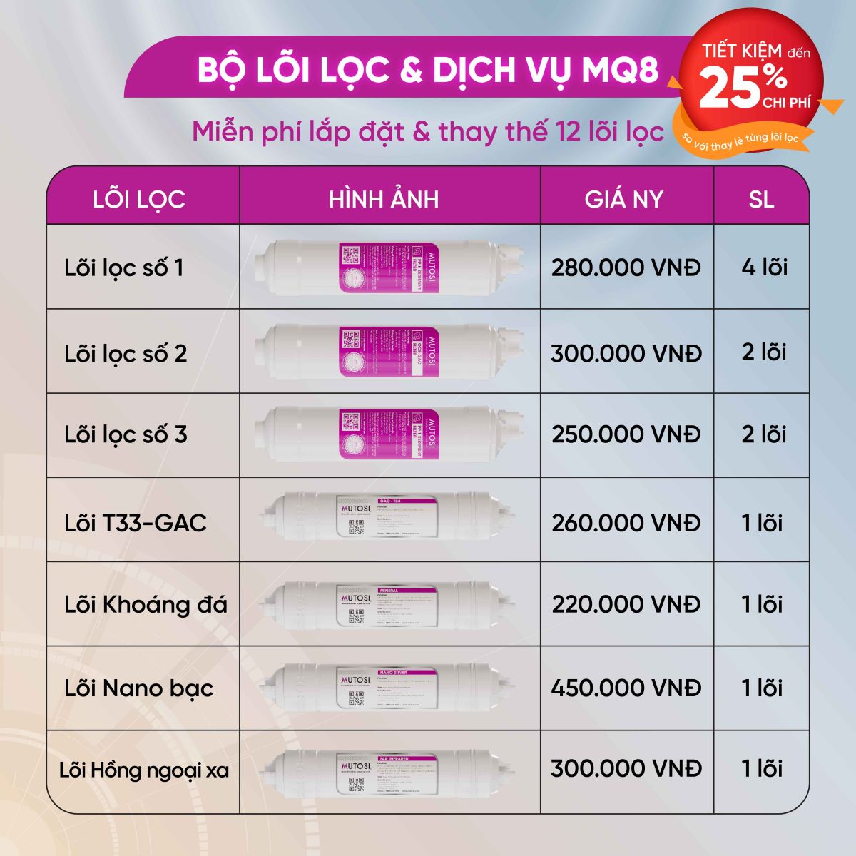 - Thay thế miễn phí 7 lõi: lõi số 1, lõi số 2, lõi số 3, lõi T33-GAC, lõi khoáng đá, lõi Nano bạc, lõi hồng ngoại xa trong quá trình sử dụng gói dịch vụ